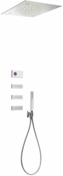 Fehér elektronikus vezérlő Falba építhető elektronikus 3 utas belső egység 500 x 500 mm-es rozsdamentes acél mennyezeti fejzuhannyal 3 vízkőmentesített fúvókával Vízkőmentesített kézi zuhannyal és fali tartóval Szatén zuhanytömlővel Króm kivitel
