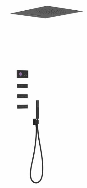 Fekete elektronikus vezérlő Falba építhető elektronikus 4 utas belső egység 500 x 650 mm-es rozsdamentes acél mennyezeti fejzuhany 2 fúvókával 3 vízkőmentesített fúvókával Vízkőmentesített kézi zuhannyal és fali tartóval Szatén zuhanytömlővel Matt fekete színben