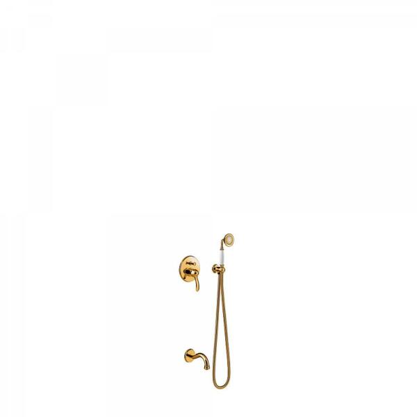 Falba építhető kivitel Tartalmazza a belső egységet Egykaros, 2 utas csapteleppel 78 mm-es, vízkőmentesített kézi zuhannyal és fali tartóval Kádkifolyóval Duplán reteszelt zuhanytömlővel Arany színben