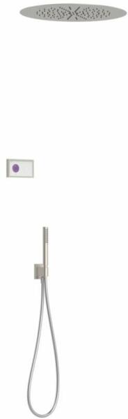 Fehér elektronikus vezérlő Falba építhető elektronikus belső egység 500 mm átmérőjű rozsdamentes acél mennyezeti fejzuhannyal Vízkőmentesített kézi zuhannyal és fali tartóval Szatén zuhanytömlővel Acél színben