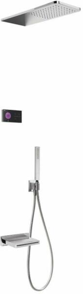 Fekete elektronikus vezérlőpanel Falba építhető elektronikus 3 utas belső egységet tartalmazza 210 x 550 mm-es rozsdamentes acél fejzuhannyal Acél cascade kádkifolyóval Vízkőmentesít ett kézi zuhannyal és fali tartóval Szatén zuhanytömlővel Króm kivitel