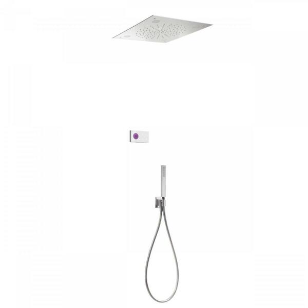 Fehér elektronikus vezérlőpanel Falba építhető elektronikus belső egységet tartalmazza 500 x 500 mm-es rozsdamentes acél mennyezeti fejzuhannyal Vízkőmentesített kézi zuhannyal és fali tartóval Szatén zuhanytömlővel Króm kivitel