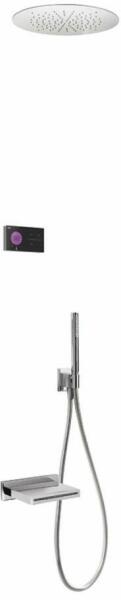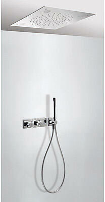 Fehér elektronikus vezérlő Falba építhető elektronikus 3 utas belső egység 500 x 500 mm-es rozsdamentes acél mennyezeti fejzuhany 2 fúvókával 760 mm-es zuhanyrúd vízbemenettel Vízkőmentesíte tt kézi zuhannyal Szatén zuhanytömlővel Króm kivitel
