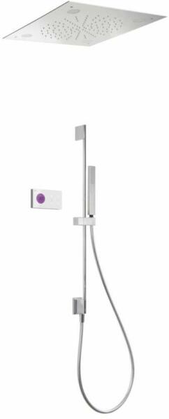 Fehér elektronikus vezérlőpanel Falba építhető elektronikus belső egységet tartalmazza 500 x 500 rozsdamentes acél mennyezeti fejzuhannyal 760 mm-es zuhanyrúd vízbemenettel Vízkőmentesíte tt kézi zuhannyal Szatén zuhanytömlővel Króm kivitel