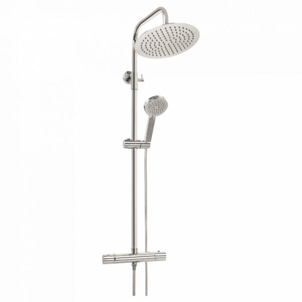 Invena Imola teleszkópos zuhanyrendszer termosztátos csapteleppel, króm AU-11-001-Q Tulajdonságok Telepítés: falsíkon kívül Zuhanyrúd és zuhanyfej anyaga: rozsdamentes acél Állítható magasságú zuhanyrúd: 850-1150 mm Termosztatikus csapteleppel: hőmérséklet zár 38 fokon Kádkifolyó nélkül Váltás a funkciók között: a csaptelep gombjában Kerek fejzuhany átmérője: 250
