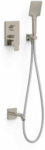 Tres Project falsík alatti zuhany csaptelep kádkifolyóval és Rapid-Box belső egységgel, rozsdamentes acél hatású 1128070AC Falba süllyesztett szerelés, beépített RAPID-BOX Elzárás és áramlásszabályozás Rapid-bo x és rejtett test, gyorsan és egyszerűen telepíthető Kádkifolyóval Zuhanytartó Kádkifoly ó kinyúlási hosszúsága: 143 mm Vízkő elleni kézi zuhany 96x110