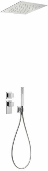 Falba építhető kivitel Tartalmazza a termosztátos belső egységet 380 x 380 mm-es rozsdamentes acél mennyezeti fejzuhannyal Vízkőmentesített kézi zuhannyal Szatén zuhanytömlővel Króm kivitel