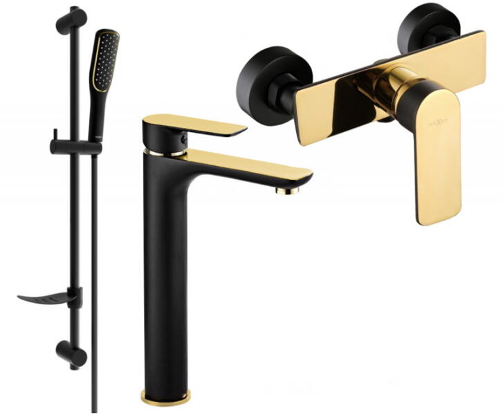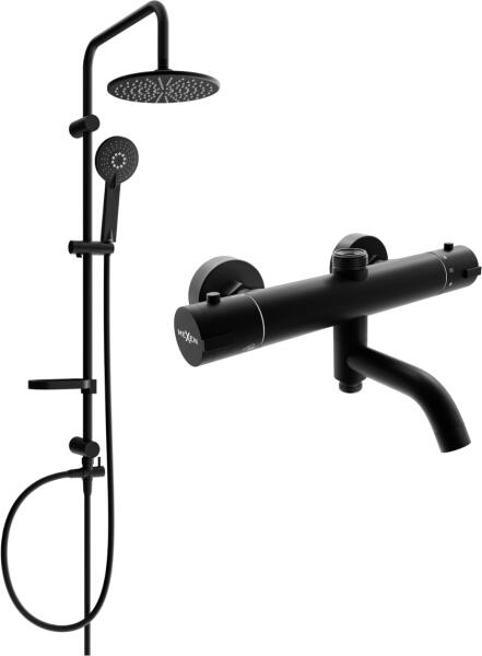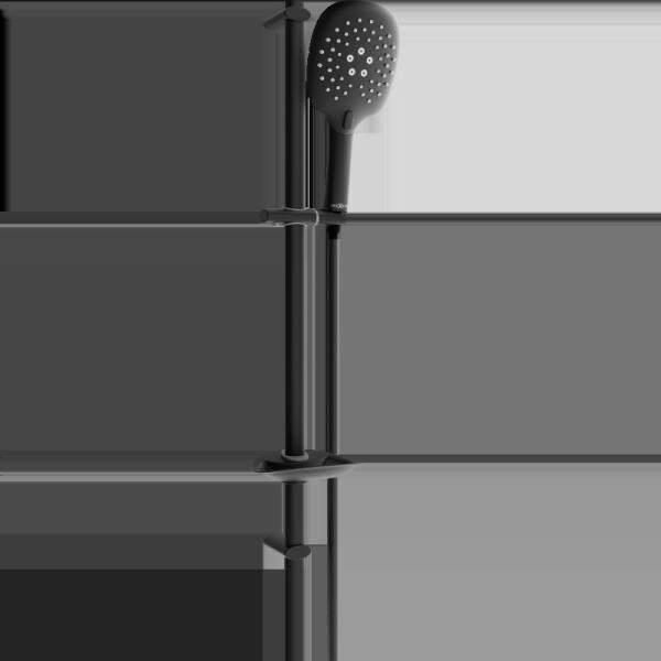 A fekete-matt zuhanykészlet kádcsaptelepekhez egy 3 állású kézizuhanyzót, egy csuklós zuhanytartót és egy 150 cm-es csavarodásgátlós műanyag rugalmas zuhanytömlőt tartalmaz.