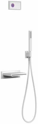 Fehér elektronikus vezérlőpanel Falba építhető elektronikus belső egységet tartalmazza Acél cascade kádkifolyóval Vízkőmentesít ett kézi zuhannyal és fali tartóval Szatén zuhanytömlővel Matt fehér színben