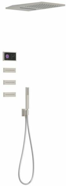 Fekete elektronikus vezérlő Falba építhető elektronikus 4 utas belső egység 280 x 550 mm-es rozsdamentes acél fejzuhany 2 fúvókával 3 vízkőmentesített fúvókával Vízkőmentesített kézi zuhannyal és fali tartóval Szatén zuhanytömlővel Acél színben
