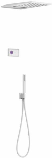 Fehér elektronikus vezérlő Falba építhető elektronikus 3 utas belső egység 280 x 550 mm-es rozsdamentes acél fejzuhany 2 fúvókával Vízkőmentesített kézi zuhannyal és fali tartóval Szatén zuhanytömlővel Matt fehér színben