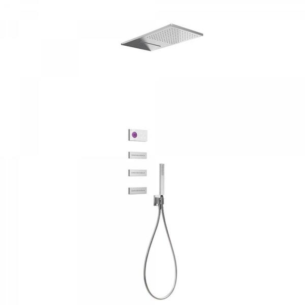 Fehér elektronikus vezérlő Falba építhető elektronikus 4 utas belső egység 280 x 550 mm-es rozsdamentes acél fejzuhany 2 fúvókával 3 vízkőmentesített fúvókával Vízkőmentesített kézi zuhannyal és fali tartóval Szatén zuhanytömlővel Króm kivitel