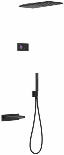 Fekete elektronikus vezérlőpanel Falba építhető elektronikus 3 utas belső egységet tartalmazza 210 x 550 mm-es rozsdamentes acél fejzuhannyal Acél cascade kádkifolyóval Vízkőmentesít ett kézi zuhannyal és fali tartóval Szatén zuhanytömlővel Matt fekete színben