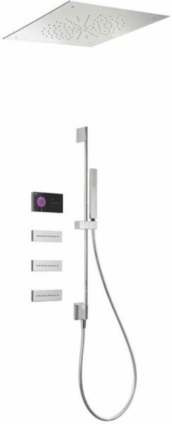 Fekete elektronikus vezérlő Falba építhető elektronikus 3 utas belső egység 500 x 500 mm-es rozsdamentes acél mennyezeti fejzuhannyal 3 vízkőmentesített fúvókával 760 mm-. es zuhanyrúd vízbemenettel Vízkőmentesíte tt kézi zuhannyal Szatén zuhanytömlővel Króm kivitel