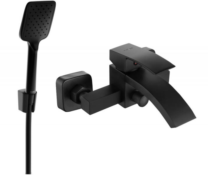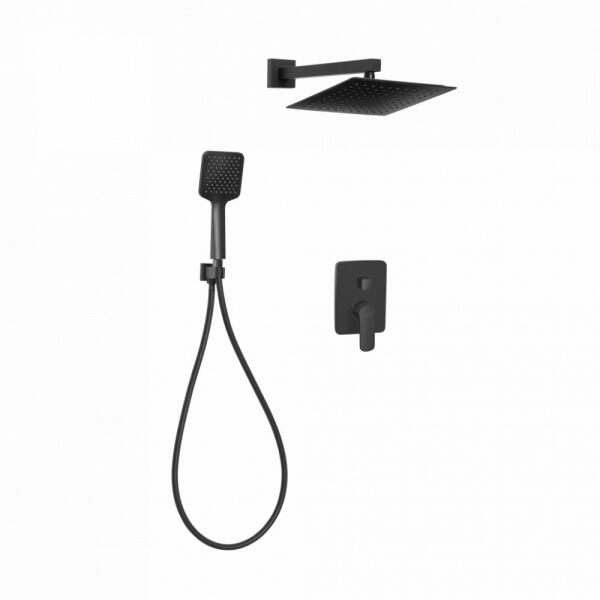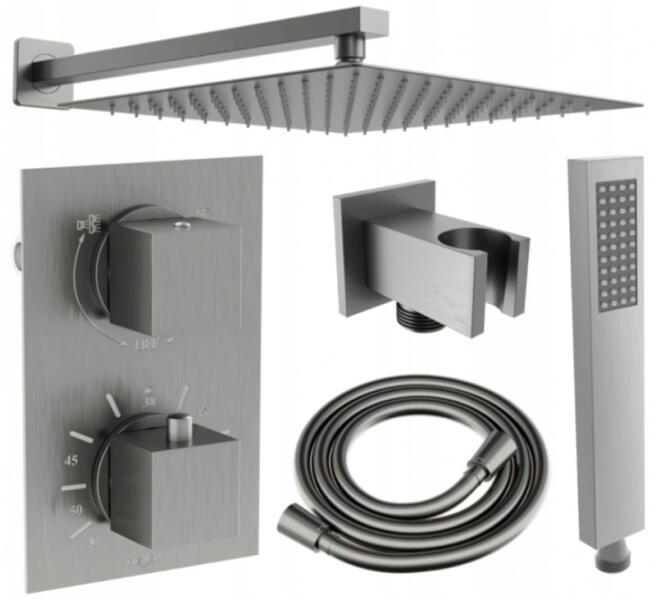 Falba építhető kivitel Tartalmazza a termosztátos belső egységet 300 x 300 mm-es gömbcsuklós fejzuhannyal Vízkőmentesített kézi zuhannyal Szatén zuhanytömlővel Matt fekete színben