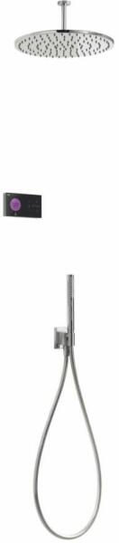 Fekete elektronikus vezérlő Falba építhető elektronikus belső egység 300 mm-es gömbcsuklós mennyezeti fejzuhannyal Vízkőmentesített kézi zuhannyal és fali tartóval Szatén zuhanytömlővel Króm kivitel