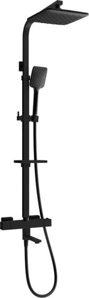 Fekete színű termosztátos falra szerelhető kerámiabetétes zuhanyrendszer kádtöltős csapteleppel, szögletes formában, 20 cm-es esőztetővel, 150 cm-es pvc vel bevont csavarodásmentes zuhany gégecsővel, zuhanyfejtartóval zuhanyfejjel és szappantartóval. A csaptelep felülete korrozió és kopásálló. A kifolyócső elfordítható. Stuxi Cube fekete kerámiabetétes termosztátos