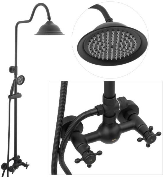 Erga Delek, retro stílusú zuhanygarnitúra esőfejjel 21cm, matt fekete, ERG-YKA-BP. DELEK-BLK Műszaki adatok: Gyártó: Erga Anyaga: sárgaréz / porszórt acél / ABS műanyag Szín: fekete matt Fej: sárgaréz 35 mm Állítható oszlopmagasság: 74 - 110 cm Szett típusa: Falra szerelhető, kétlyukú nyomáskapcsolóval, 21 cm átmérőjű esőzuhanyfejjel és kézizuhannyal Kézizuhanyfej