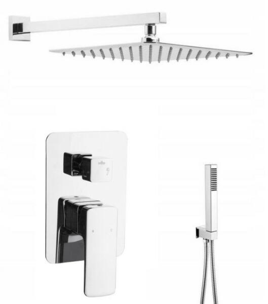Gamma ZN6 falsík allati zuhanyszett. A készlet tartalmazza a váltókapcsolós csaptelepet, a kézizuhanyt gégecsővel és fali rögzítővel, valamint az esőztető fejzuhanyt a zuhanykarral. Szögletes formavilág, kiváló eleme egy modern vagy minimál stílusú fürdőszobának. Paraméterek: zuhany csaptelep (falsík alattikerámia fejjel) 37 cm-es fali zuhanykar 25x25 cm-es esőztető, u