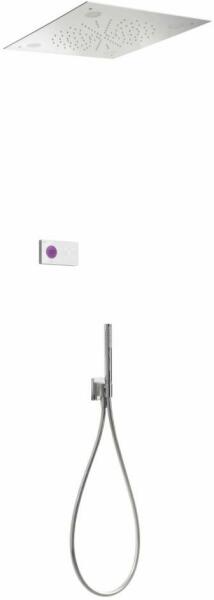 Fehér elektronikus vezérlő Falba építhető elektronikus belső egység 500 x 500 mm-es mennyezeti fejzuhannyal Vízkőmentesített kézi zuhannyal és fali tartóval Szatén zuhanytömlővel Króm kivitel