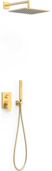 Tres Project falsík alatti zuhanyrendszer Rapid-Box belső egységgel, matt arany 21128004OM Falba süllyesztett szerelés, beépített RAPID-BOX Elzárás és áramlásszabályozás Rapid-box és rejtett test, gyorsan és egyszerűen telepíthető Rozsdamentes acélból készült fix zuhanyfej 300x300 mm Zuhanytartó Vízkő elleni kézi zuhany (sárgaréz) Szatén kivitelű rugalmas tömlő