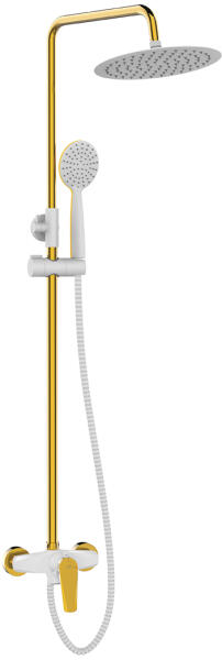 Laveo Rubio, zuhanygarnitúra karos csapteleppel, kézi és fejes esőzuhany, fehér-arany fényes, LAV-PVR_6GOB A Rubio zuhanyoszlop beépített csapteleppel komplett megoldás a zuhanyzóhoz. Az aranyrúd, kar és rozetta modern kombinációja fehér csapteleppel, esőzuhannyal és zuhanyfejjel eredeti hatást kelt. Az oszlop alkalmas a modern, merész belső terekbe a csillogás stílusában. A