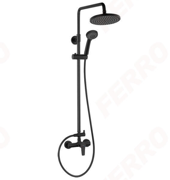 Zuhanyrendszer|Szín: fekete|*Esőztető fejzuhany:|-74,8 - 122,8 cm között állítható magasságú zuhanyrúd|-a zuhanyrúd faltól való távolsága állítható|-könnyű szerelhetőség|-fejzuhany tányér átmérője: 20 cm|-gömbcsukló a fejzuhany tányér dőlésszögének beállításához|-Ferro Easy Clean System - a vízkőlerakódás könnyű eltávolításához a fejzuhany fúvók