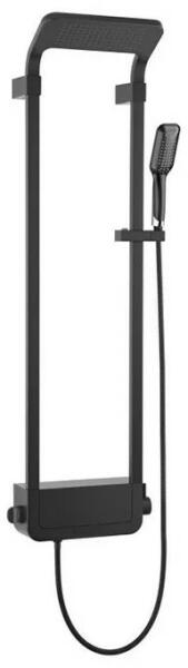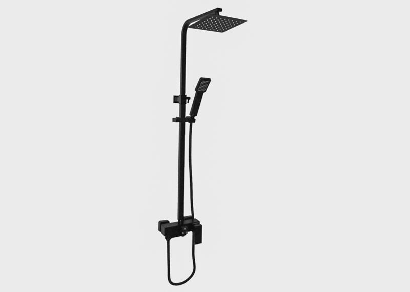 Zuhanyszett|Szín: matt fekete|3 utas, mechanikus csaptelep|Magasság: min. 75,5 - max. 122 cm|Szélesség: 20 cm|Fejzuhany: 20x20 cm (szögletes)|Szükséges víznyomás: max. 5 bar|Kézizuhany: szögletes
