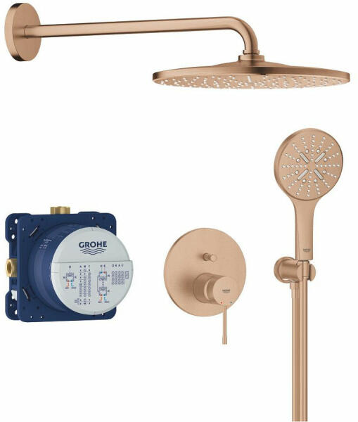 TERMÉKLEÍRÁS Szín: Brushed Warm Sunset az alábbiakból áll: concealed single-lever mixer with 2-way diverter (24 167) GROHE Rapido SmartBox univerzális beépítő doboz, 1/2" (35 604) Rainshower Mono 310 head shower set including horizontal shower arm 422 mm Rainshower SmartActive 130 hand shower 3 sprays shower outlet elbow 1/2" with holder (26 658) Silverflex zuhanygégecső 1.500 mm 1/2"